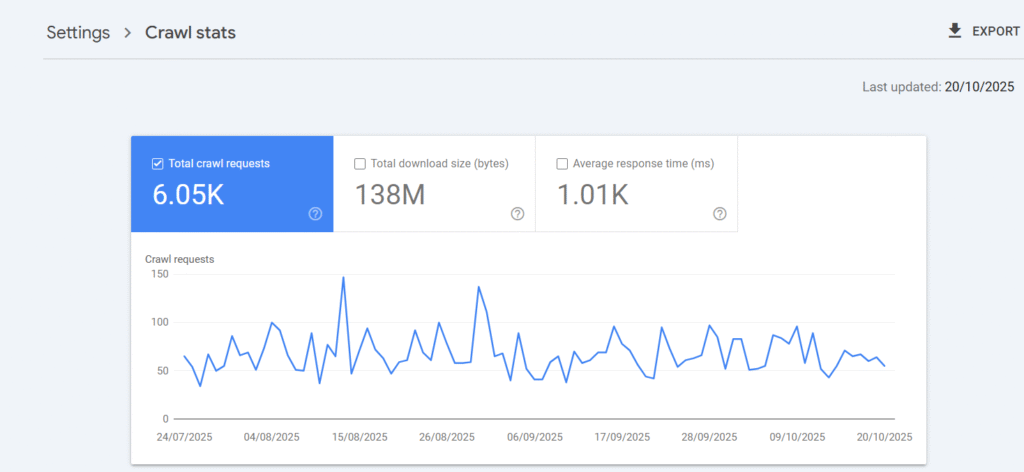 The crawl activity can be reviewed at Google Search Console → Settings → Crawl stats report.